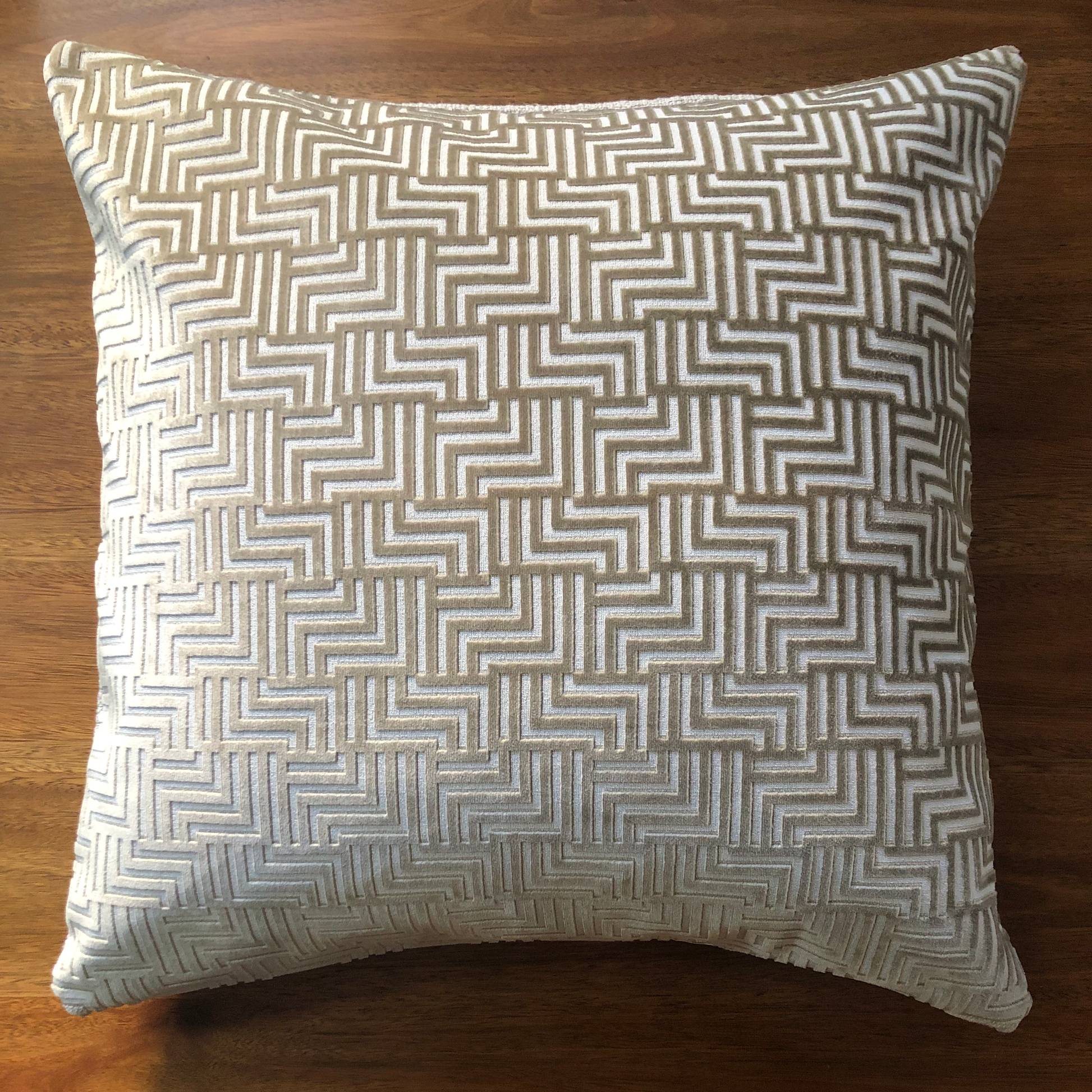The combination of geometric lines with a cut-pile jacquard velvet makes for a striking cushion.